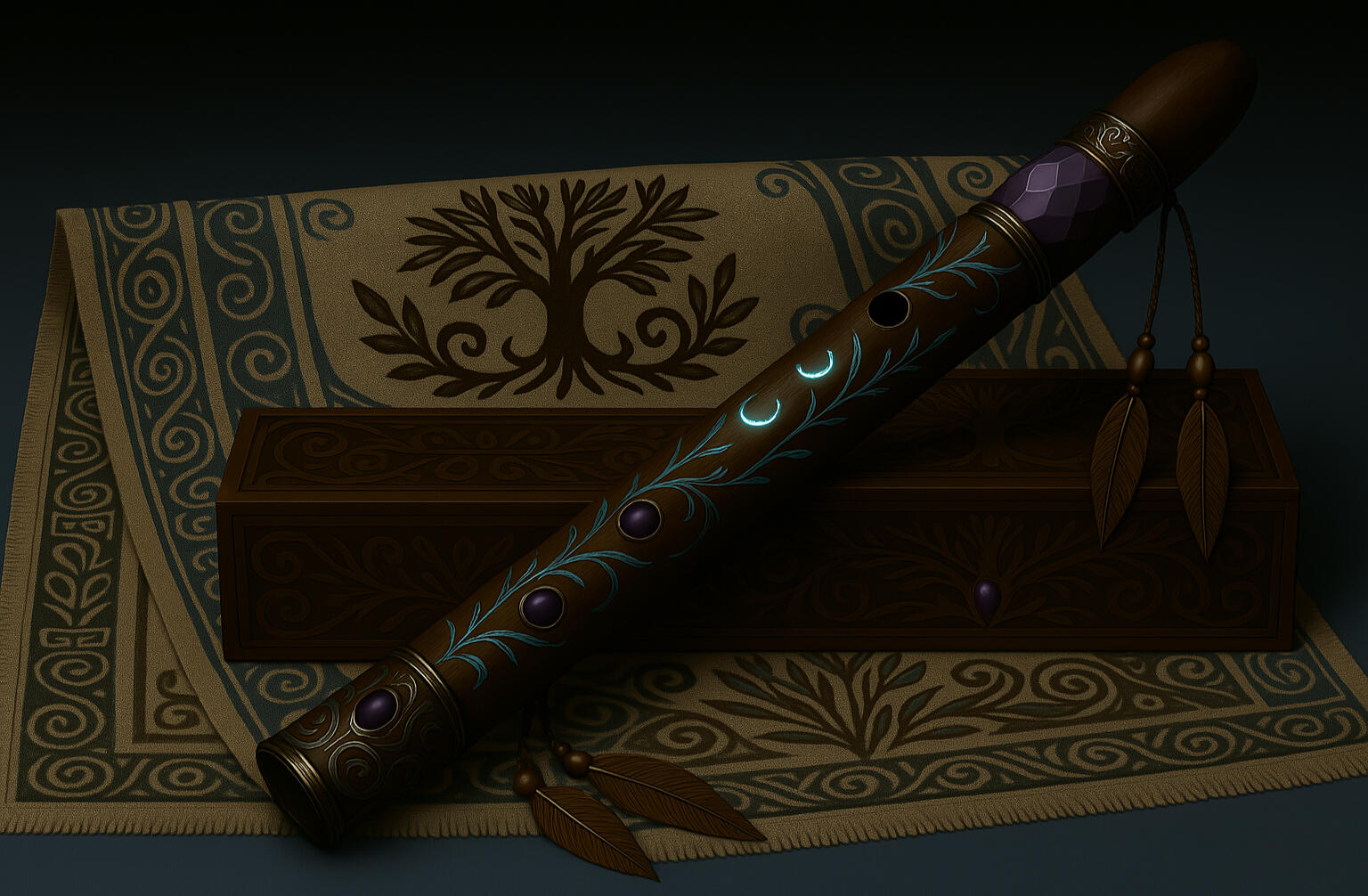 Wood: The body of the flute is crafted from the heartwood of an ancient tree, possibly one of the oldest trees in the Twelveswood, known for its strength and resonance. It's believed it may even be a branch from Everschade, the sacred Guardian Tree itself. This wood was freely given to the elders by the elementals, symbolizing their blessing and approval of the creation of this beautiful instrument.Metals: The keys and intricate inlays are made from mythril ore that was refined and polished while being blessed under the moon -which is both lightweight and durable. The metal has been etched with delicate patterns of vines and leaves, representing the