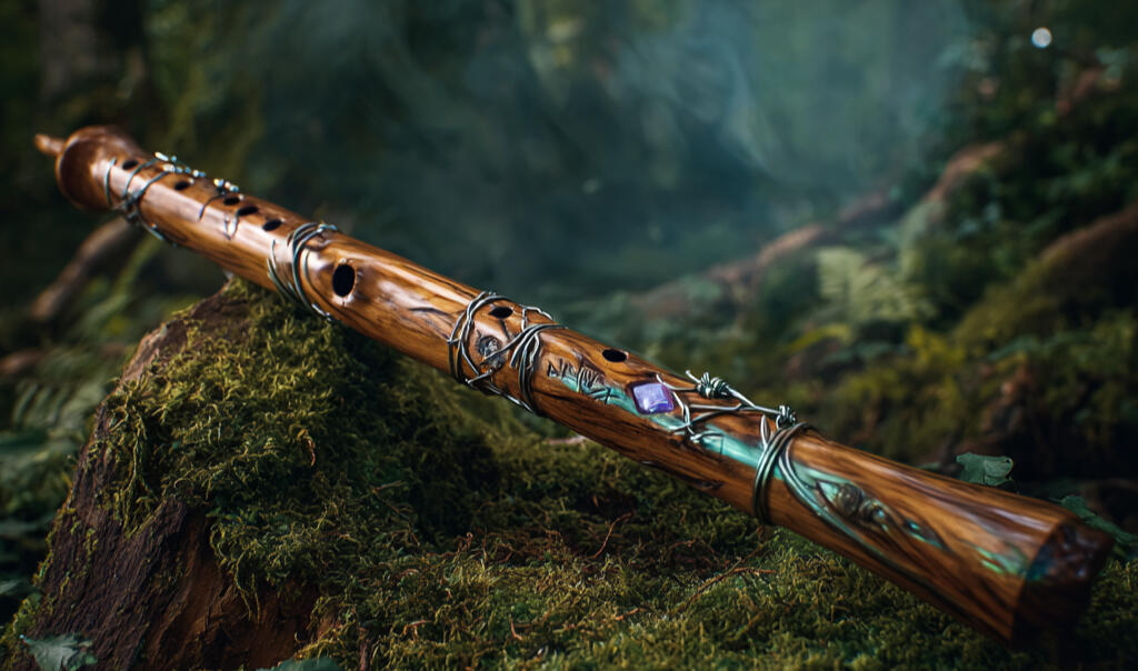 harmony between nature and music. This metal was also offered freely by the elementals and deities of the area from which it had been acquired and offered by the spirits who guarded this particularly vein from those they didn't deem worthy.Other Materials: The mouthpiece is adorned with a small, shimmering crystal, a gift from one of the sylphs, whom seemed to love following Ezra as a youth, apparently curious of his unique 'aura'. The sylph heard of the tribal elders planning to create a special instrument for one of the youth of the tribe. When they learned of it being for the one they had taken a liking too while wandering the forest, they were excited to offer it as there contribution to the special gift. This crystal enhances the flute’s magical properties, allowing it to produce sounds that resonate with the surrounding aether.Design and Appearance:
